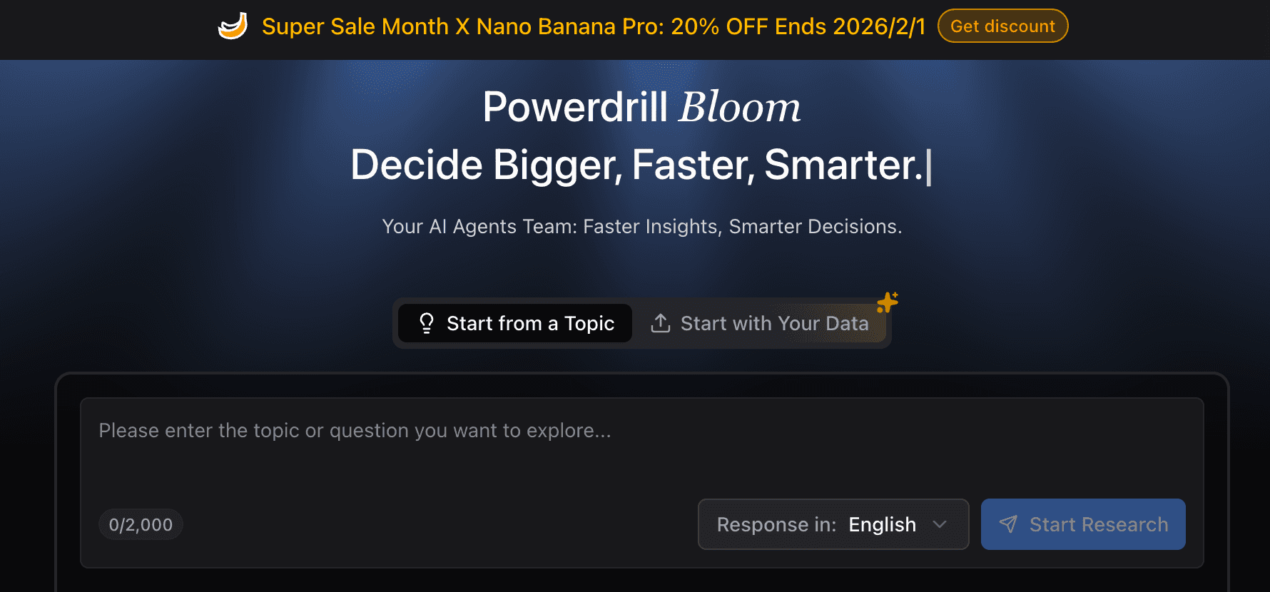 Upload your data or type your topic, and let Powerdrill Bloom with Nano Banana Pro create a masterpiece for you.