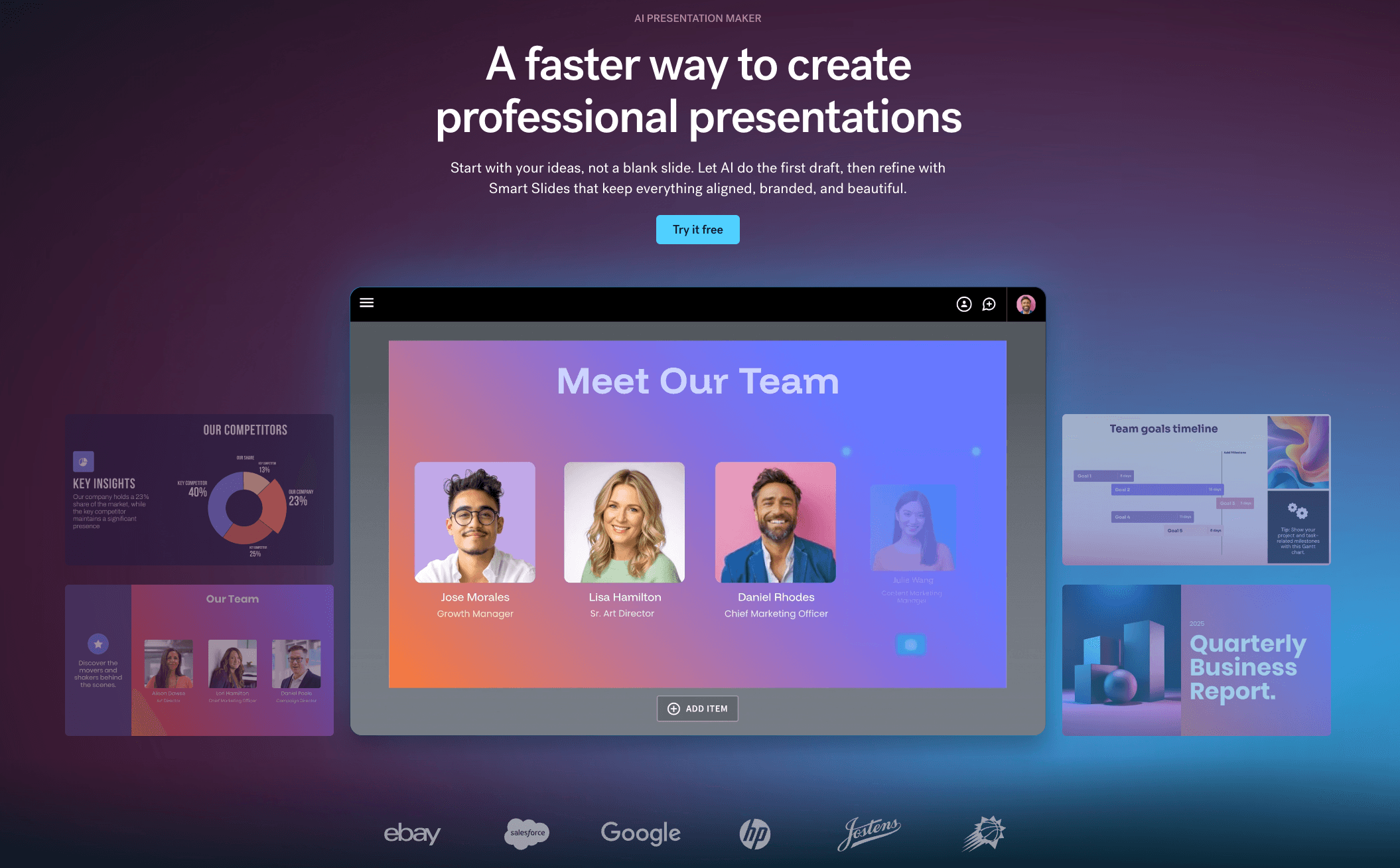 Automated design | Automates slide creation, infographics, charts | Freemium / Pro | |