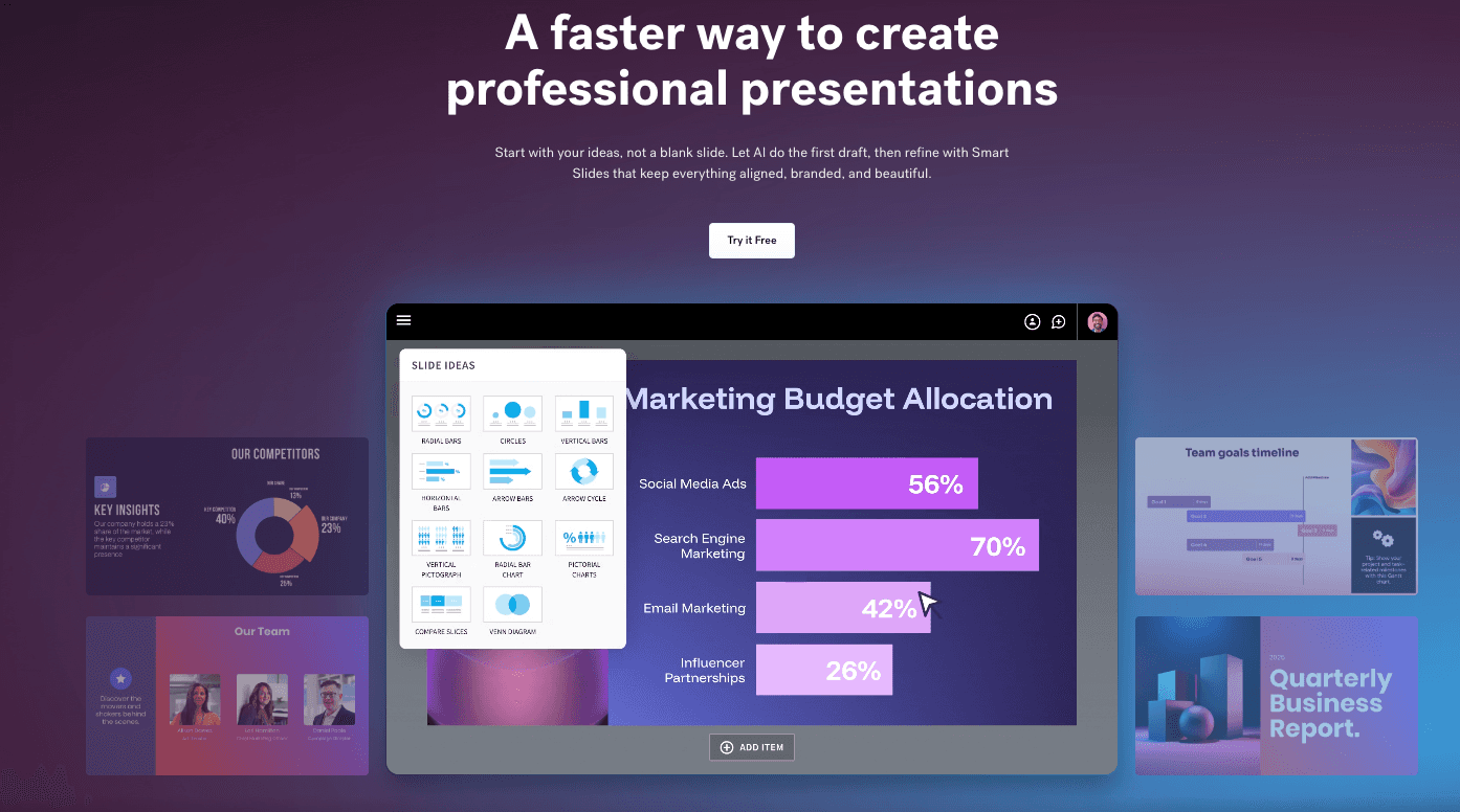 An intelligent design tool focused on "making slides beautiful" through constraints.