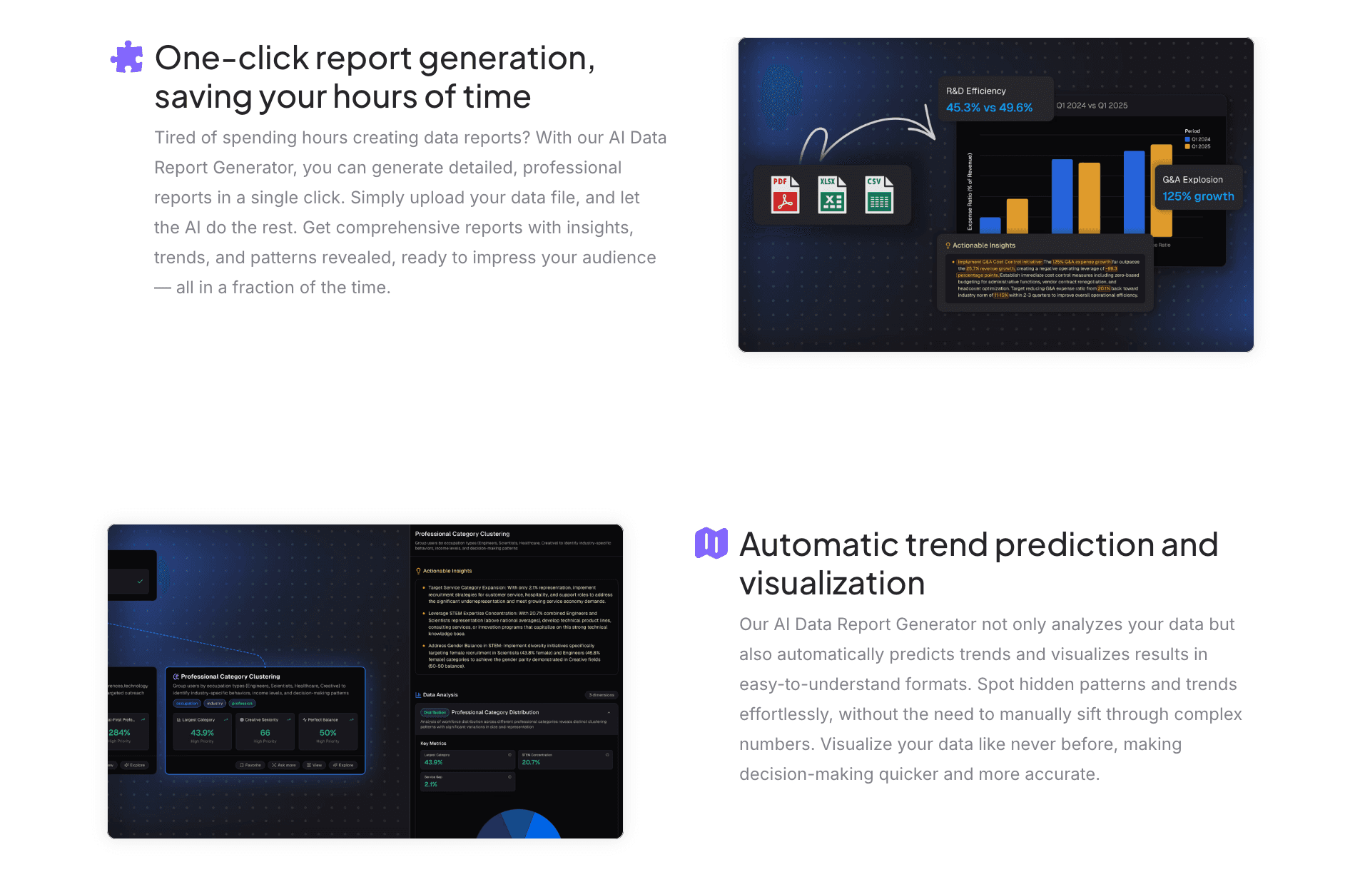 Multi-Source Data Intelligence: Uploads Excel, CSV, or PDF files; the AI automates cleaning and organizing.