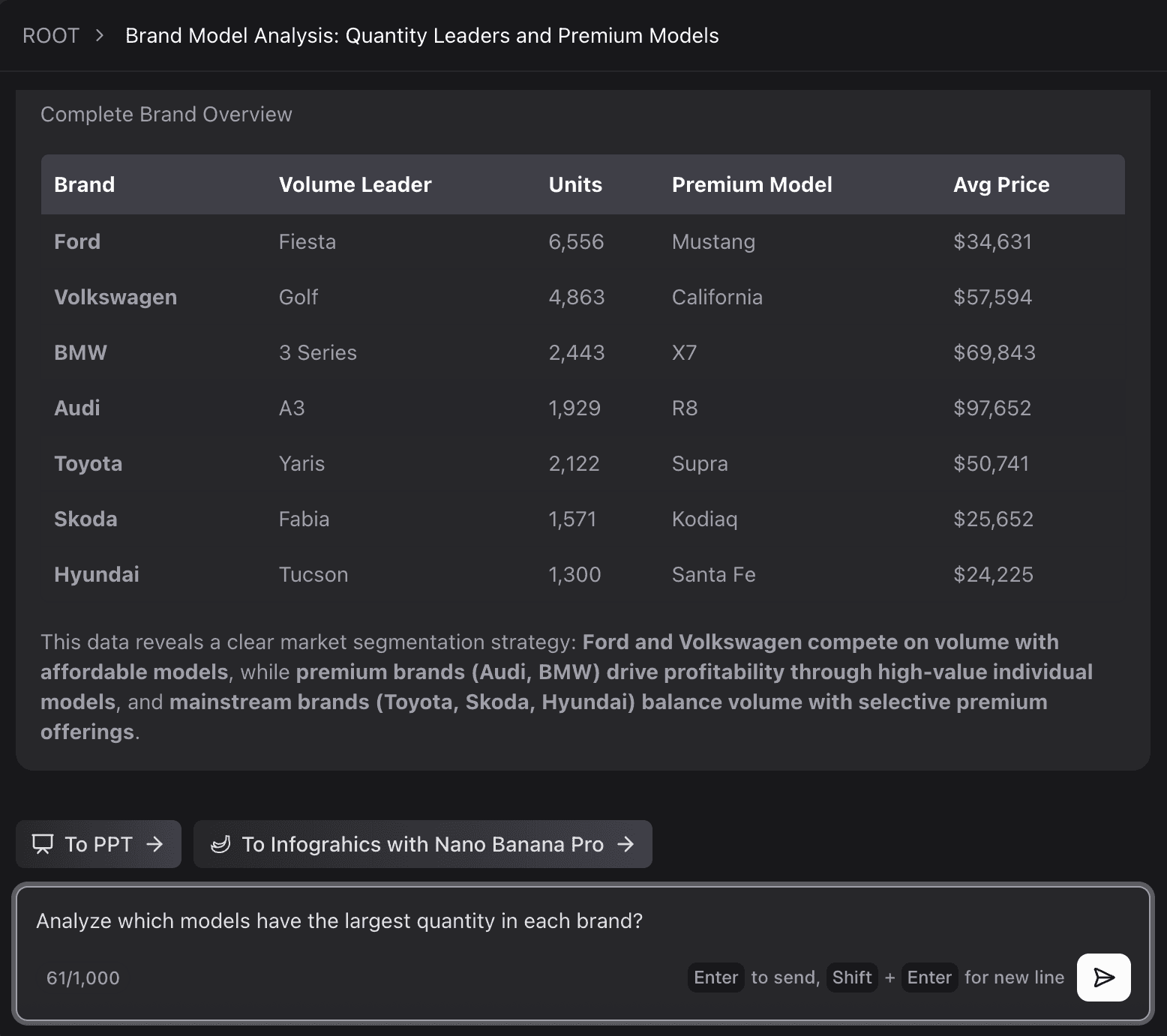Want to know "Analyze which models have the largest quantity in each brand?" Just ask.