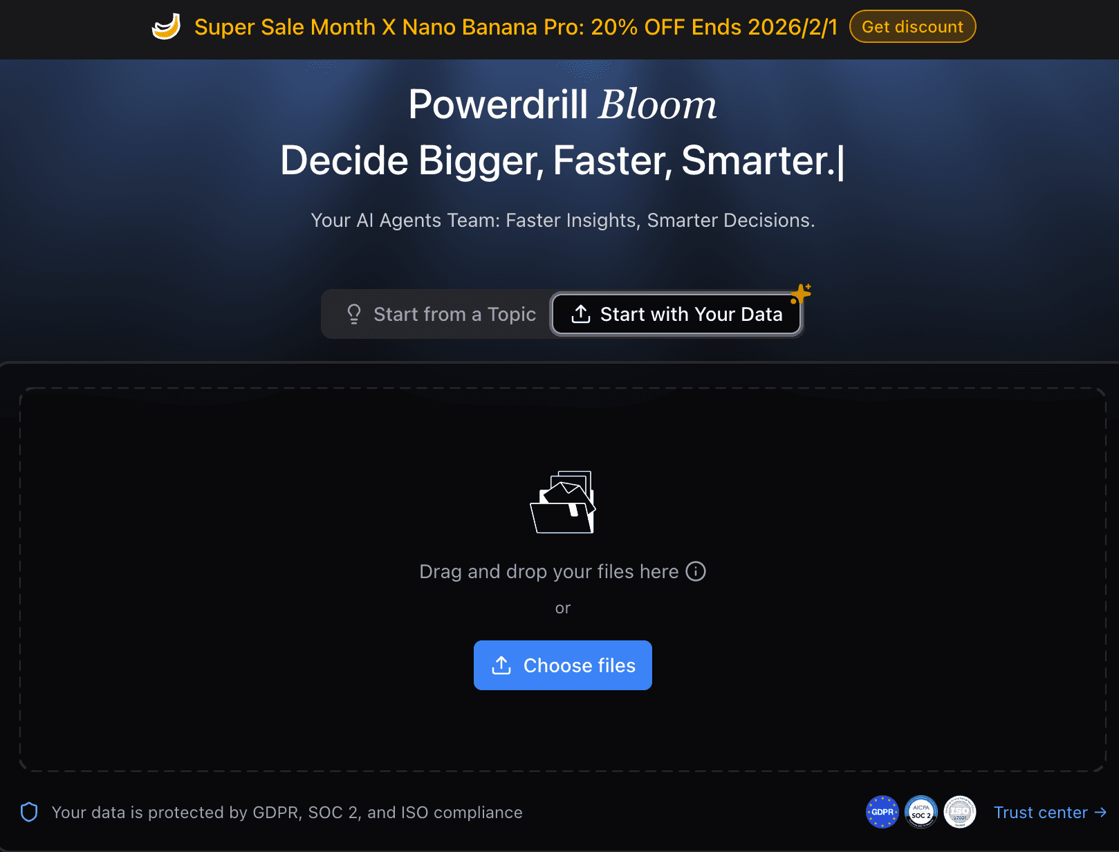 Meet Powerdrill Bloom, the next-generation data visualization agent. With the integrated Nano Banana Pro, it is the ultimate Free Graph Maker designed to turn raw data into professional-grade visuals in seconds. No design skills required—just pure data storytelling magic.
