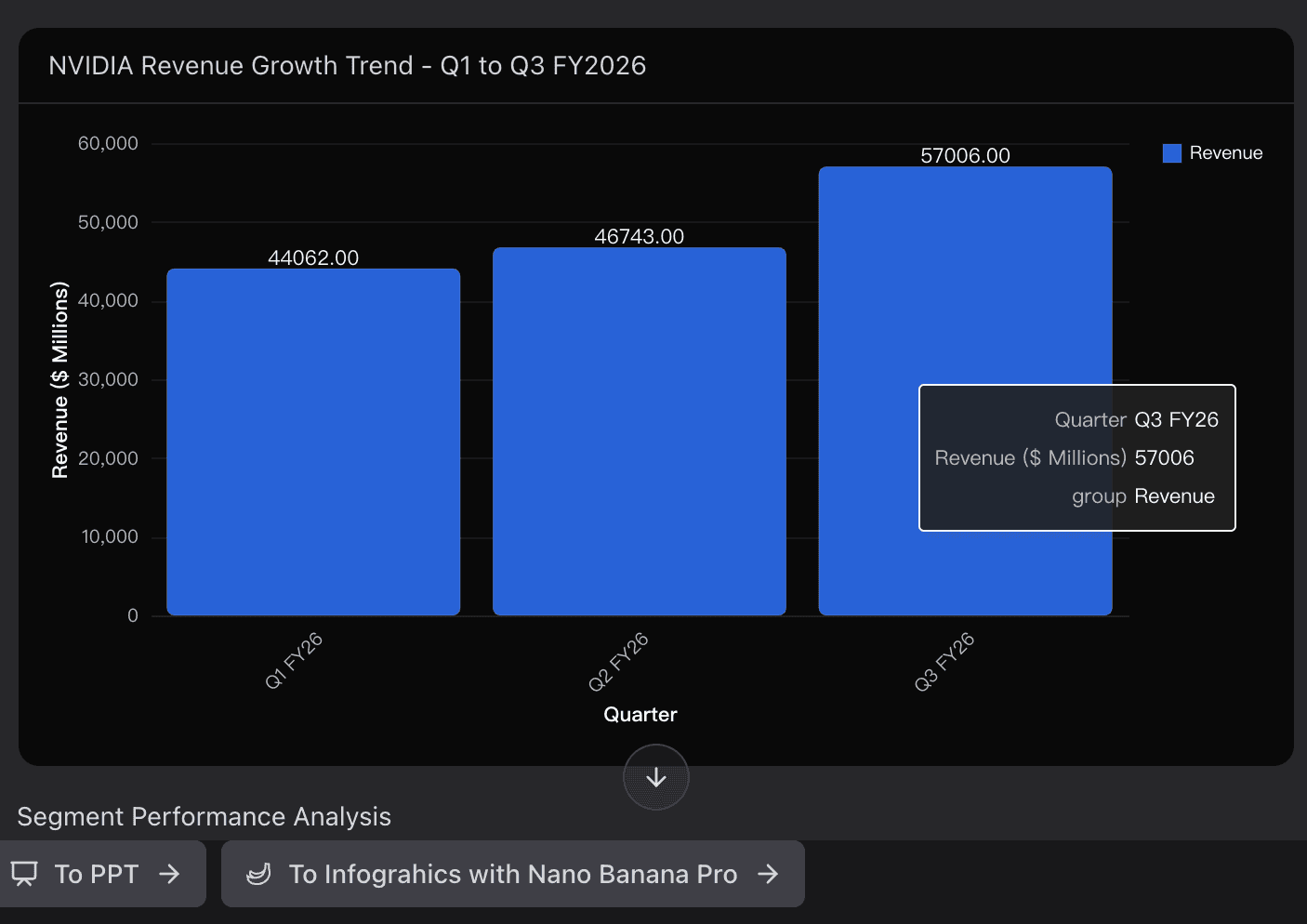 The Result: With a single click, convert your chat history, insights, and charts into a Professional, Business-ready PowerPoint Presentation. It bridges the gap from "Data Understanding" to "Value Demonstration" seamlessly.