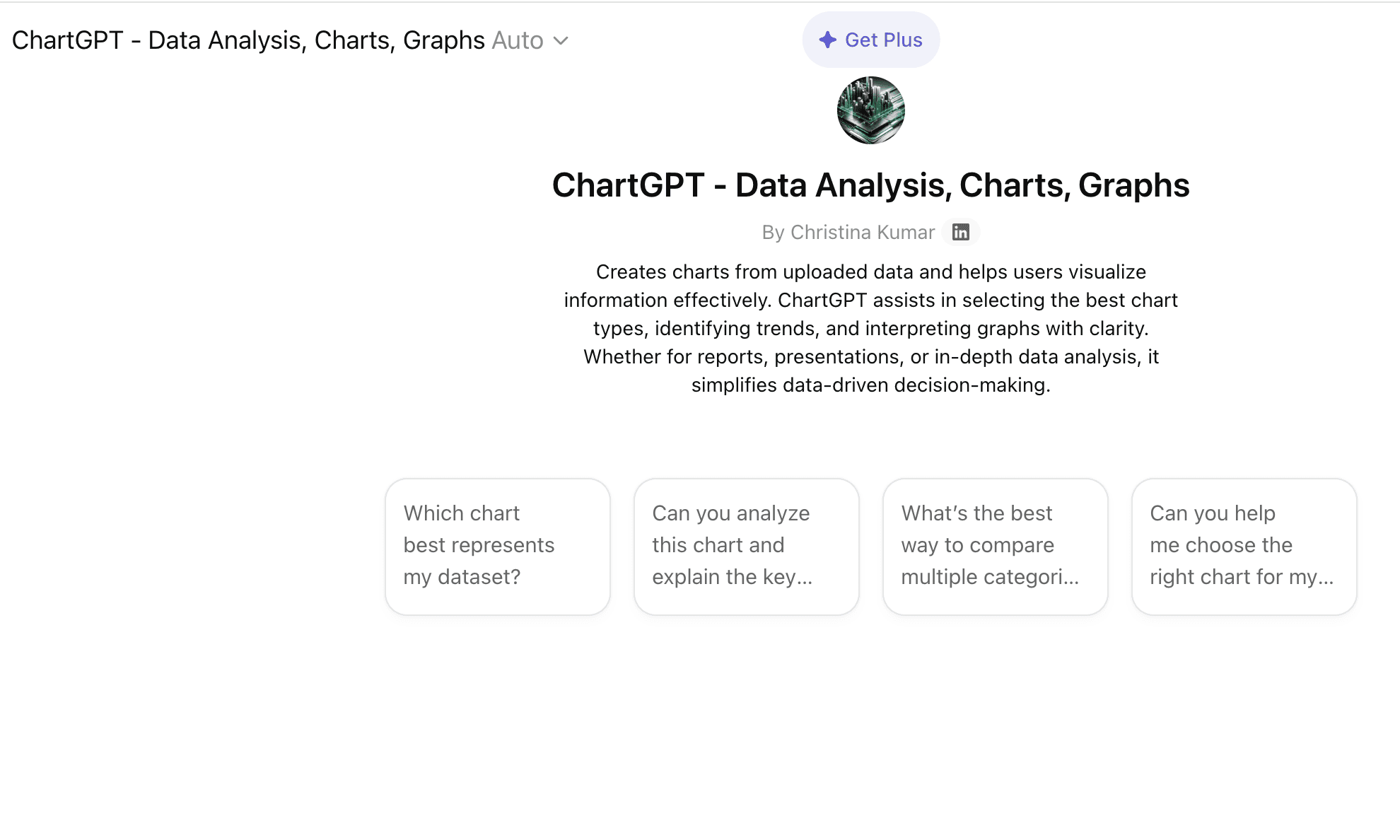 ChatGPT (データアナリスト) – 会話形式でのデータ操作と迅速なスタンドアロングラフエクスポートに最適。